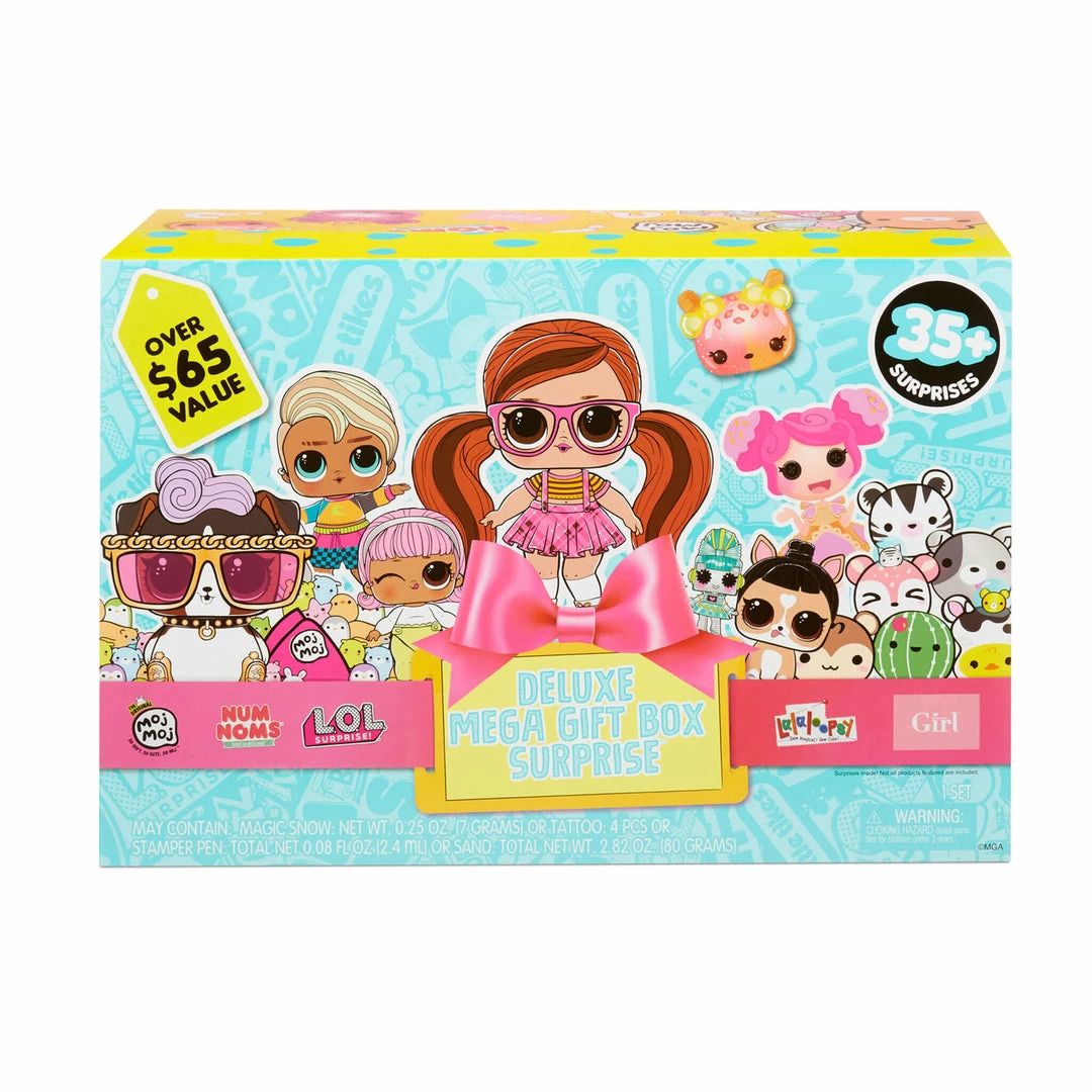 Unbox the ultimate mystery box featuring all your favorite brands. Deluxe Mega Gift Box Surprise features 35+ surprises from fan favorite brands like LOL Surprise, Lalaloopsy, Num Noms, Moj Moj and more.