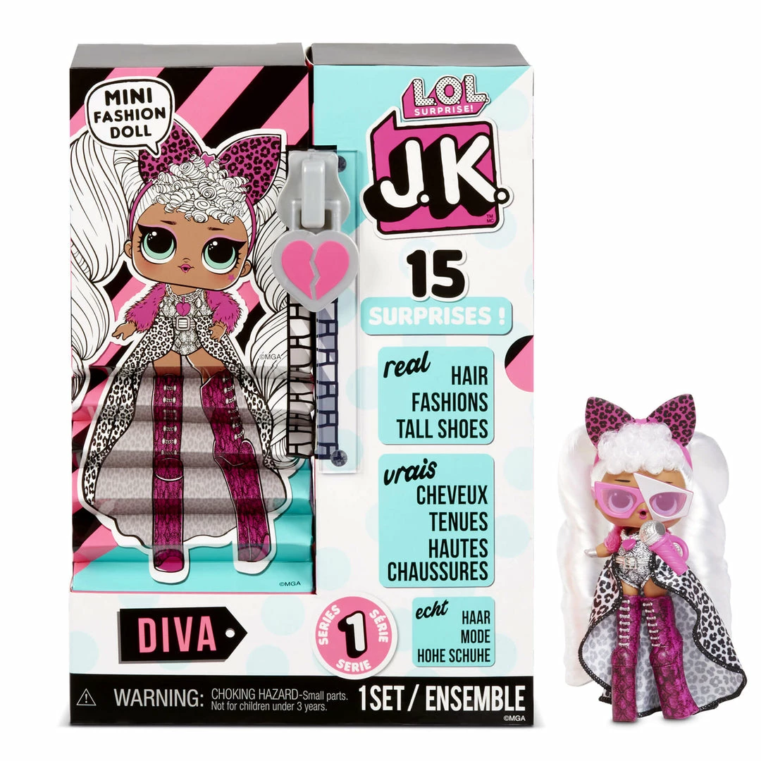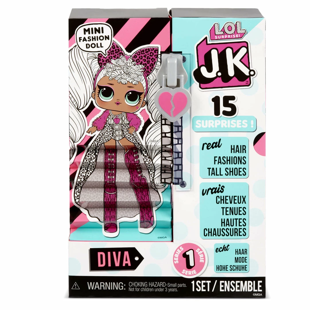 Unbox 15 surprises including a mini fashion doll with LOL Surprise JK. Fan favorite character Diva is back, but she got a fierce, runway-ready makeover.