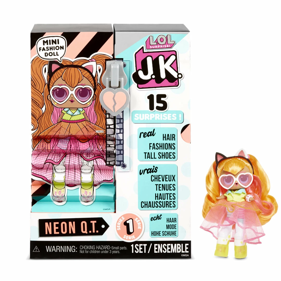 Unbox 15 surprises including a mini fashion doll with LOL Surprise JK. Fan favorite character Neon Q.T. is back, but she got a fierce, runway-ready makeover.
