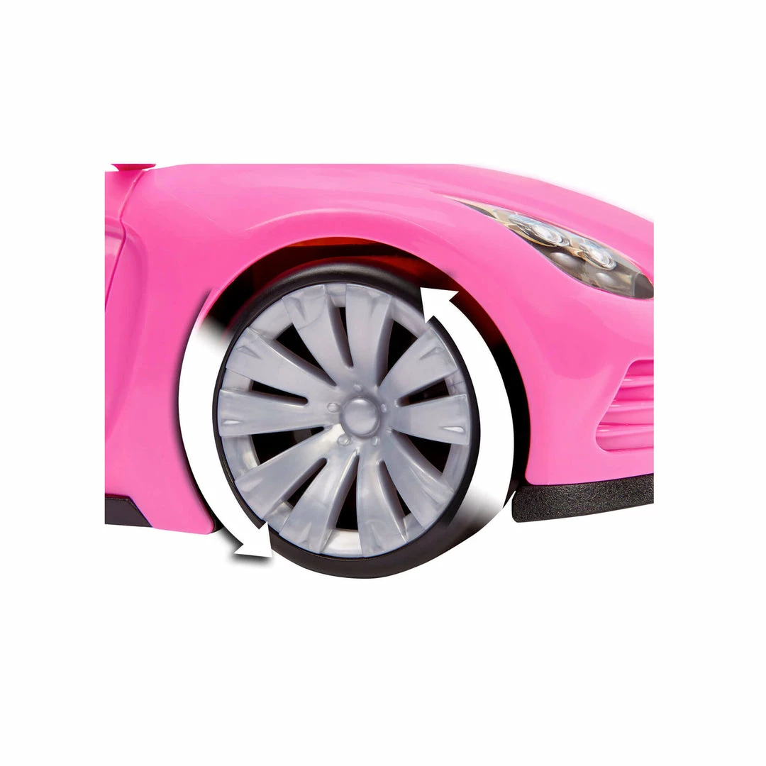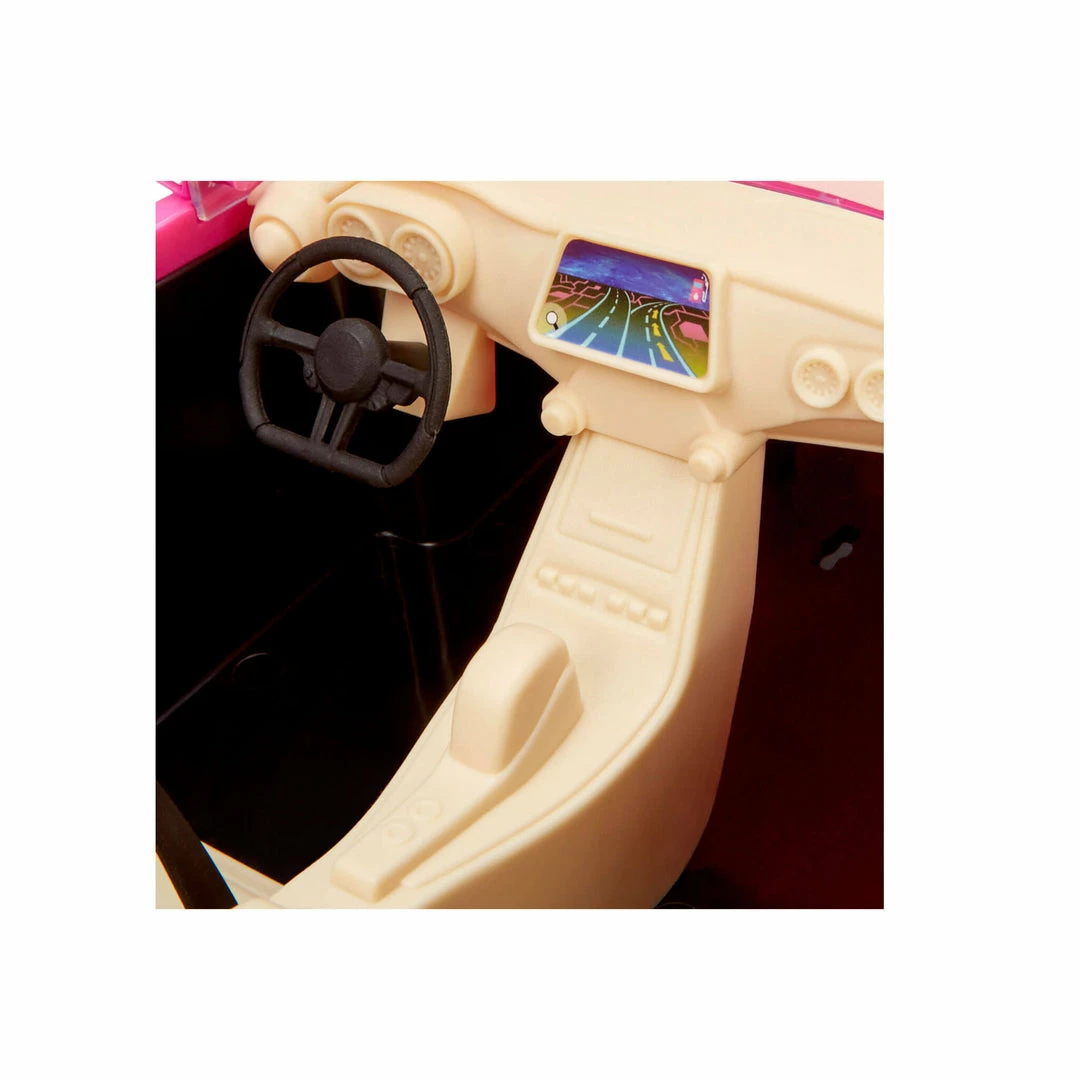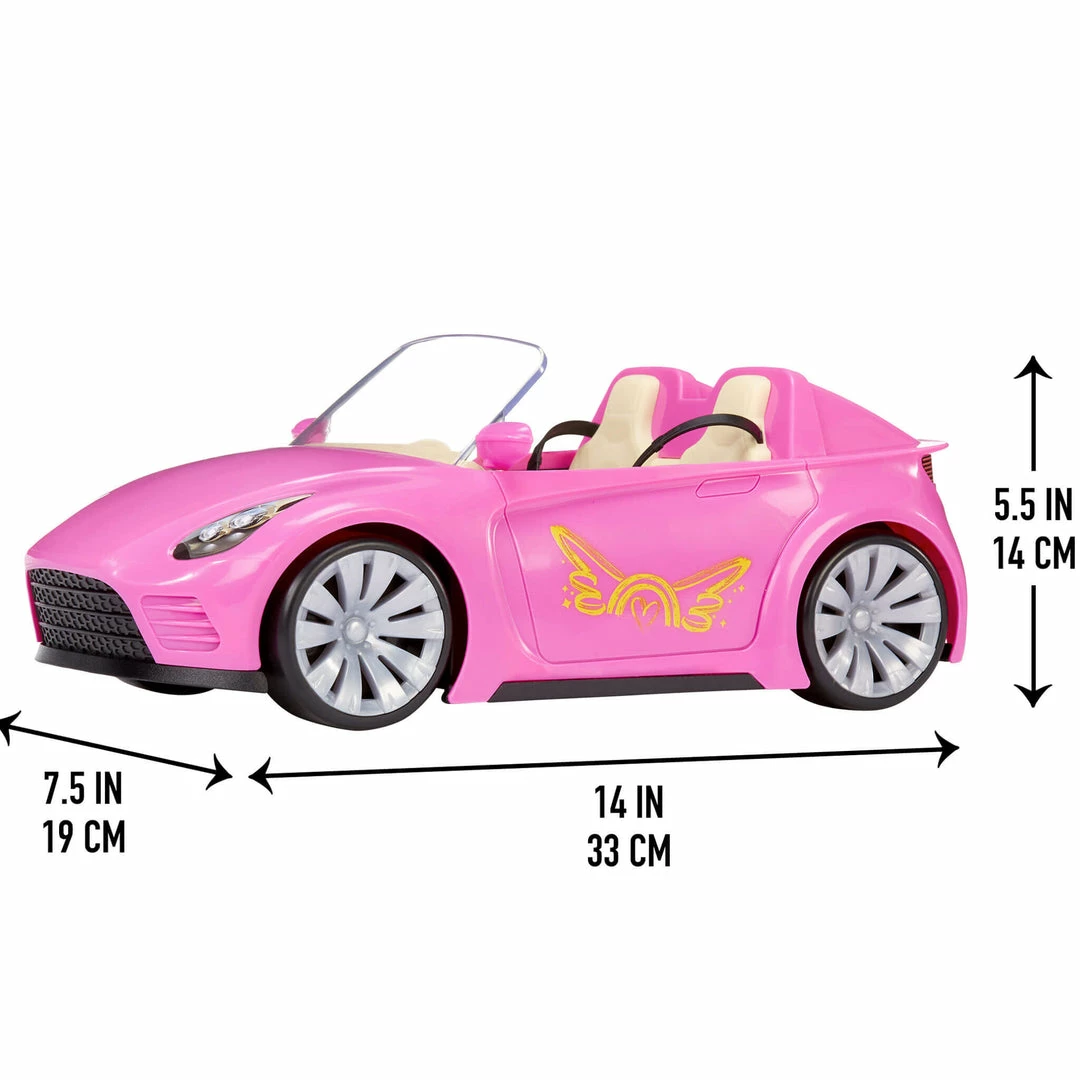 The two-seater pink car has realistic upholstery details, side view mirrors, and working seatbelts. Fits most 11.5″ fashion dolls. Dolls not included. #BeWhateverYouDream
