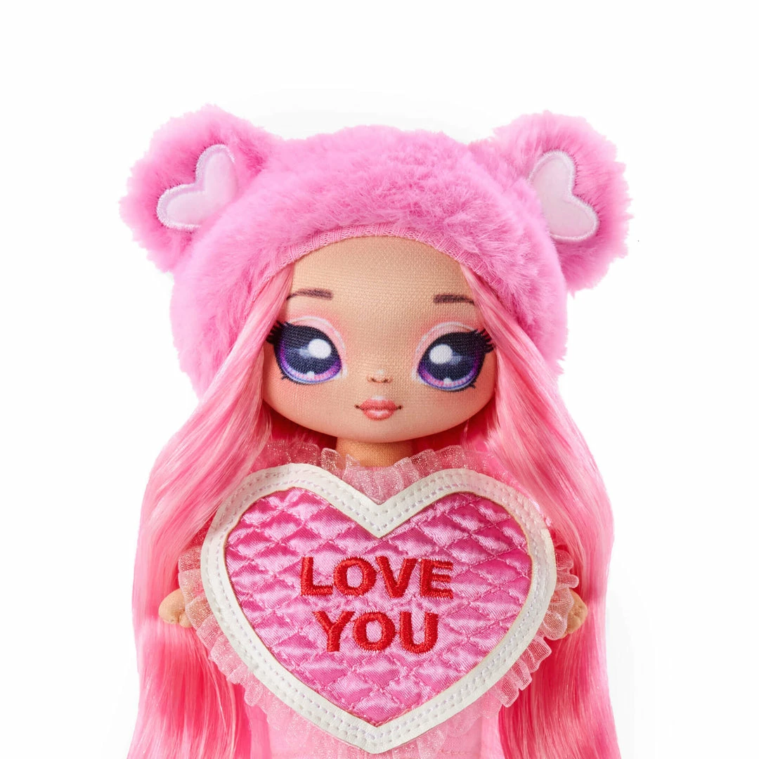 Celebrate that special someone in style with the all new Na Na Na Surprise Sweetest Hearts Fashion Doll Series! You get a soft fashion doll plus a matching brush with sweet candy heart-inspired sayings! Each doll has an adorable, quilted heart-shaped dress, bear-shaped beanie, and themed shoes to match!