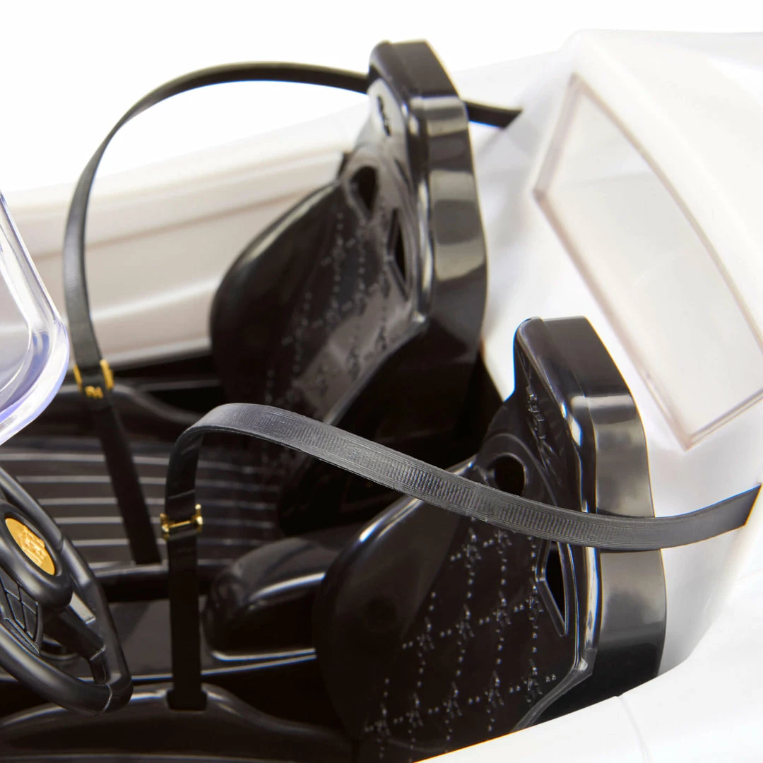 Rainbow High Color Change Car features a white body with 8-in-1 LED Color Changing Car, black interior with RH logo monogram seats, two-seater sporty convertible that fits 2 Rainbow High Fashion Dolls with working seat belts to keep your dolls safe.